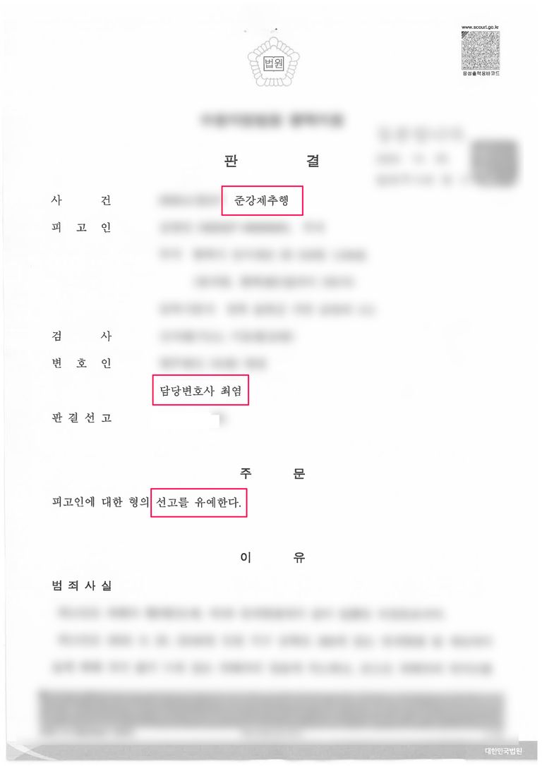 준강제추행 사건은 피해자의 처벌불원의사와 진지한 반성 태도가 뒷받침되지 않으면 실형 선고로 이어질 수 있습니다. 이번 사건은 피해 회복과 정상참작 사유를 충실히 소명하여 선고유예를 이끌어낸 의미 있는 사례입니다.