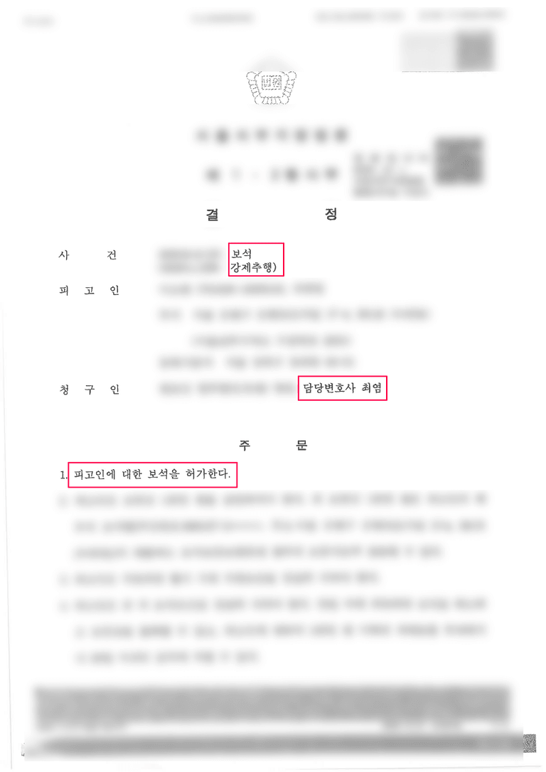 법원은 변호인의 주장을 받아들여 의뢰인에 대해 보석허가결정을 내려 구속 상태에서 석방되었습니다.