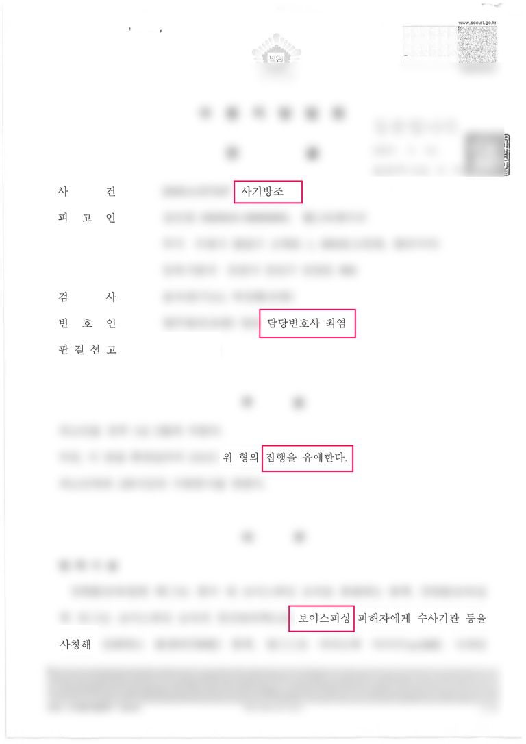 법원은 변호인의 주장을 받아들여 사기방조(보이스피싱 모집책) 혐의에 대해 집행유예를 선고했습니다.