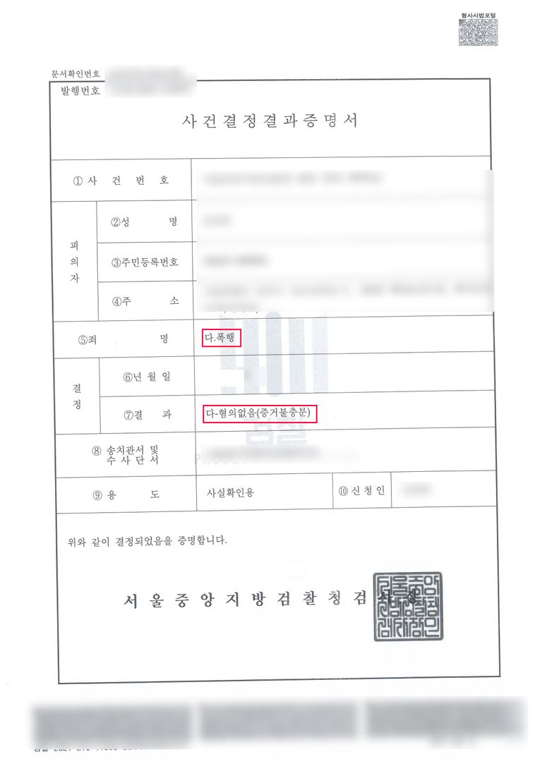 검찰은 고소인의 진술만으로는 피의사실을 인정하기 부족하며 객관적 증거가 없다는 이유로 의뢰인에게 혐의없음 불기소처분(증거불충분)을 내렸습니다.
