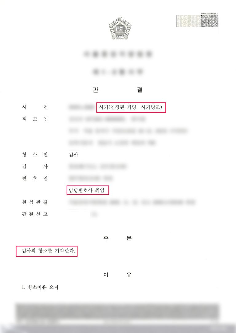 항소심 법원은 변호인의 주장을 받아들여 의뢰인에 대해 공동정범 혐의는 무죄로 유지하고, 검찰의 항소를 기각하여 1심의 사기방조 집행유예 판결이 확정되었습니다.
