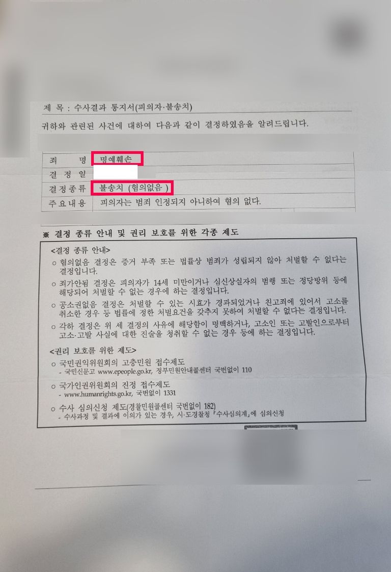 경찰은 변호인의 주장을 받아들여 발언이 공연성을 충족하지 못하고 명예훼손 혐의를 인정할 증거가 부족하다며 혐의없음 불송치처분(증거불충분)을 내렸습니다.