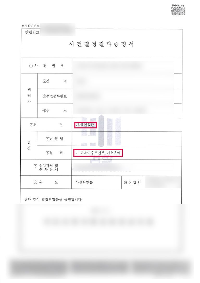 공연음란죄는 사회적으로 비난 가능성이 크고 형사처벌로 이어질 수 있는 범죄입니다. 그러나 이번 사건은 합의와 반성 태도가 인정되어 기소유예로 종결된 의미 있는 사례입니다.
