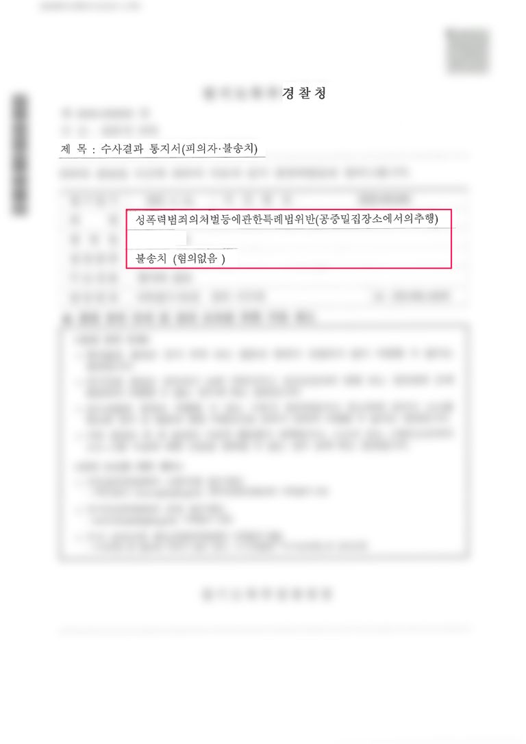 수사기관은 변호인의 주장을 받아들여 의뢰인의 행위가 공중밀집장소추행죄의 구성요건에 해당하지 않는다고 판단, 혐의없음 불송치 처분을 내렸습니다.