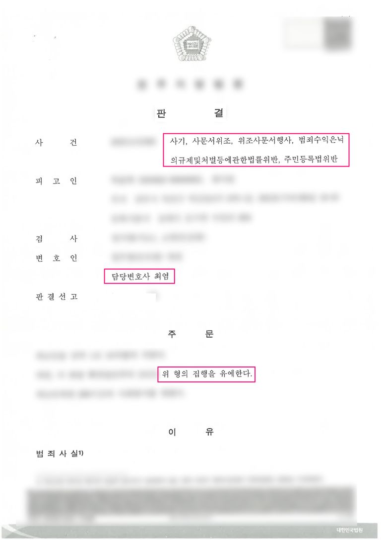 법원은 피해자 수와 편취액 규모 위조 문서 사용 등 불리한 사정에도 불구하고, 합의 및 피해회복 노력 반성 태도 등을 참작하여 의뢰인에게 집행유예를 선고했습니다.