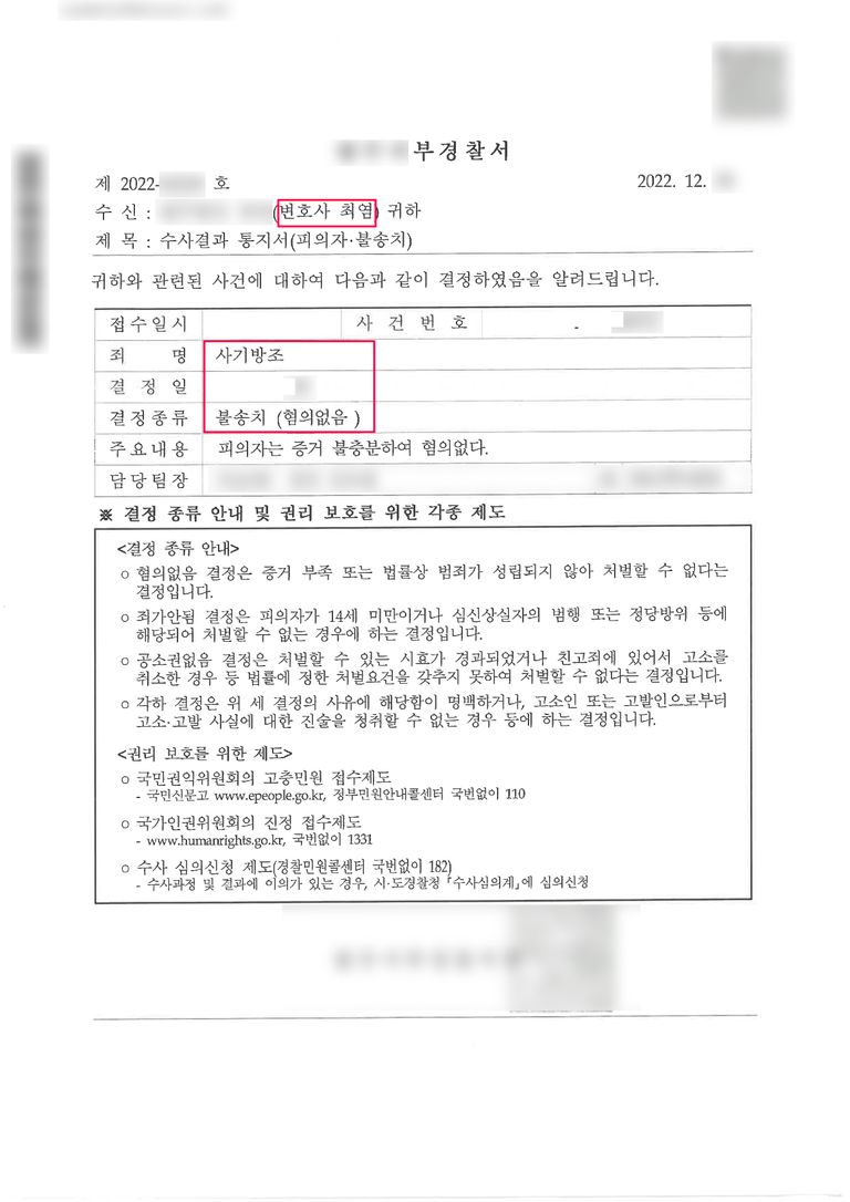 수사기관은 의뢰인이 범행에 철저히 이용당했을 뿐이며, 고의로 보이스피싱임을 인식했다고 보기 어렵다고 판단하여 혐의없음 불송치 처분을 내렸습니다.