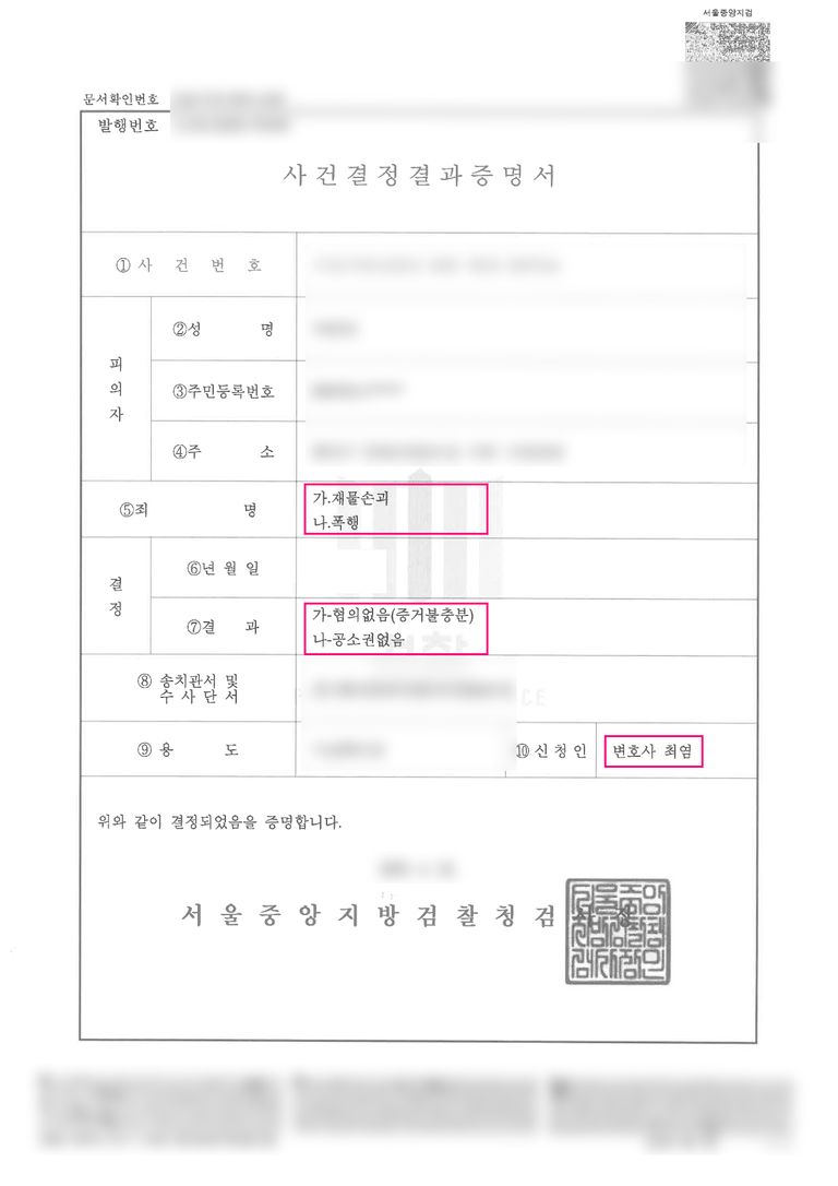 수사기관은 변호인의 주장을 받아들여 재물손괴 혐의에 대해 혐의없음 불송치 처분을 내렸고, 폭행죄는 고소인이 처벌불원의사를 표시하여 공소권없음 처분을 내렸습니다.