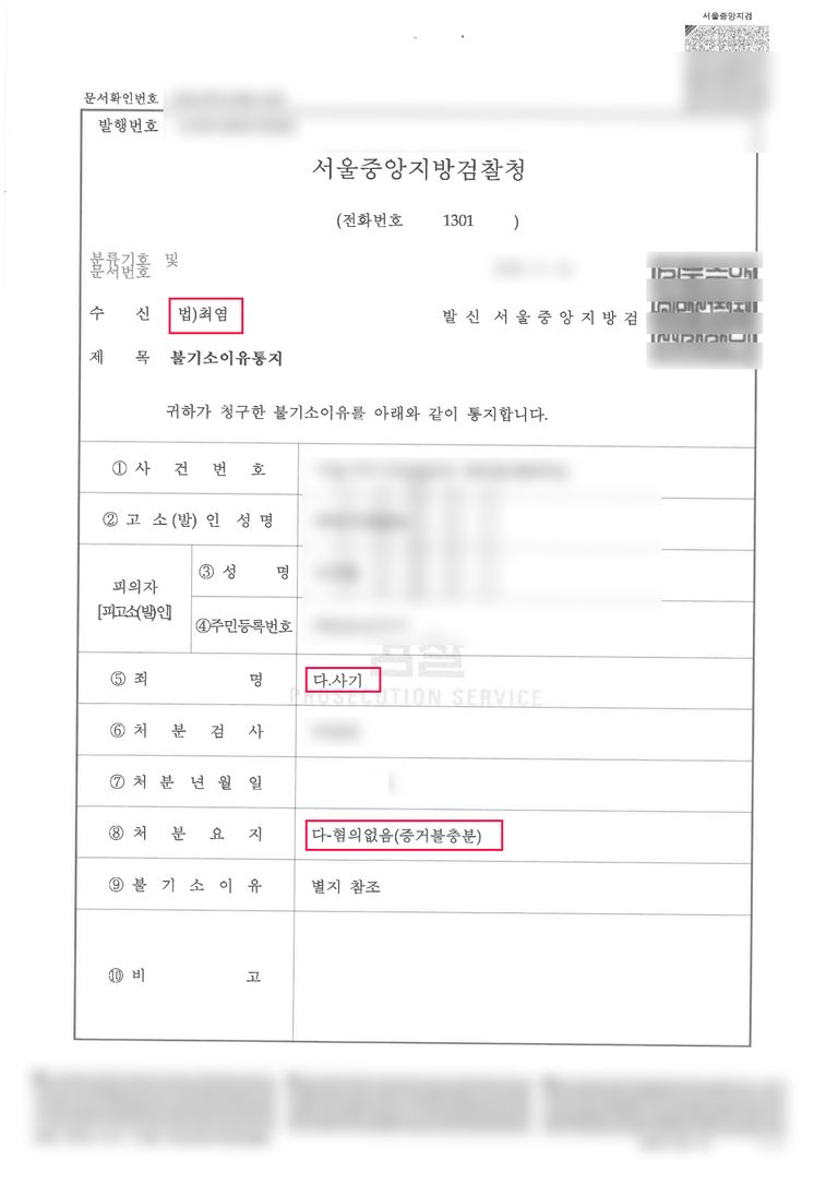 검찰은 변호인의 주장을 받아들여 공소사실을 인정하기 부족하다며 의뢰인에게 혐의없음 불기소처분(증거불충분)을 내렸습니다.