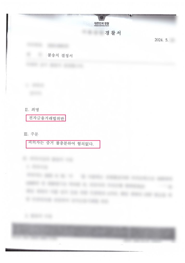 수사기관은 변호인의 주장을 받아들여 의뢰인의 행위가 전자금융거래법에서 금지하는 접근매체 대여에 해당하지 않는다고 판단, 혐의없음 불송치 처분을 내렸습니다.