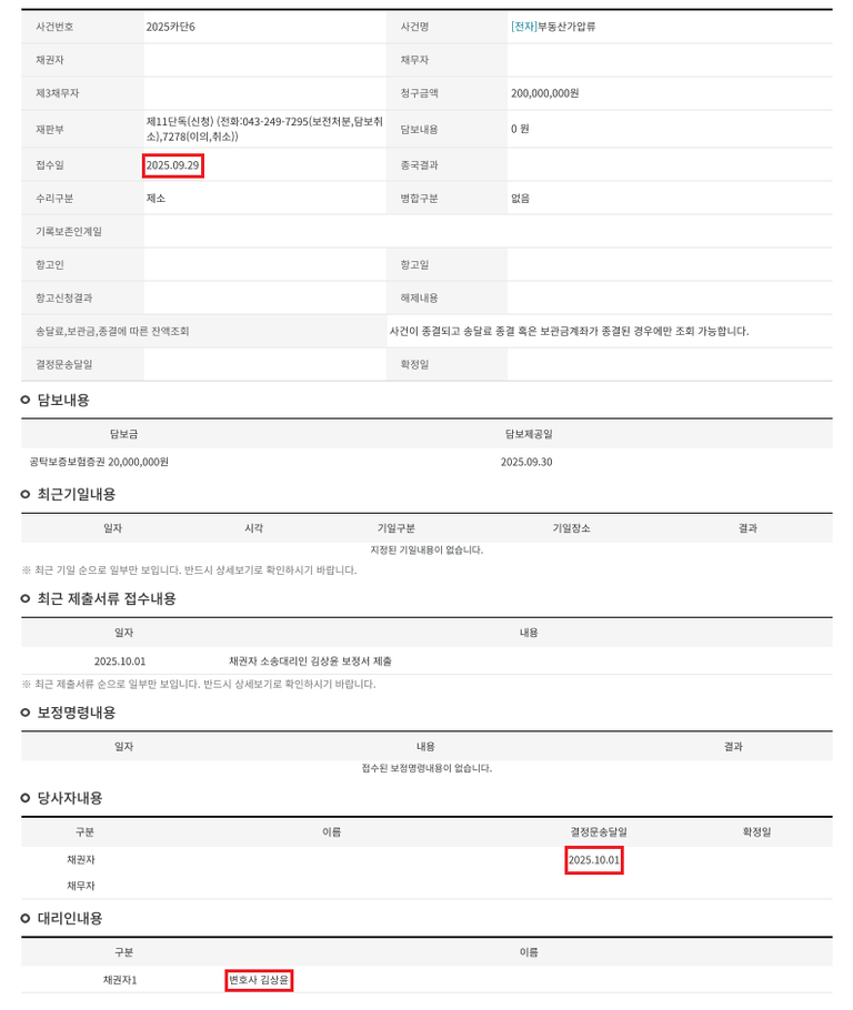 채무자로부터 2억 원을 회수해야 하는 의뢰인을 대리하여, 채무자의 재산 은닉 및 처분 가능성에 대비해 2025.09.29. 채무자 소유 부동산에 대해 부동산 가압류 신청을 진행하였습니다.