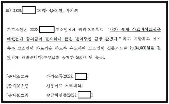 ✅ 2단계: 금전 거래 내역 정리 -> 300건의 송금 내역과 대화 기록을 하나하나 분석, 의뢰인과 수차례 상담을 통하여 사기죄로 '명확히' 인정될 수 있는 부분만 추출하여 고소사실로 정리