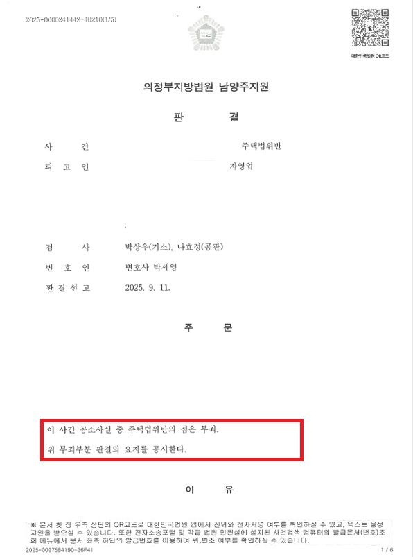 아래와 같이 주택법 공소사실에 대하여 '무죄'가 선고되었습니다.