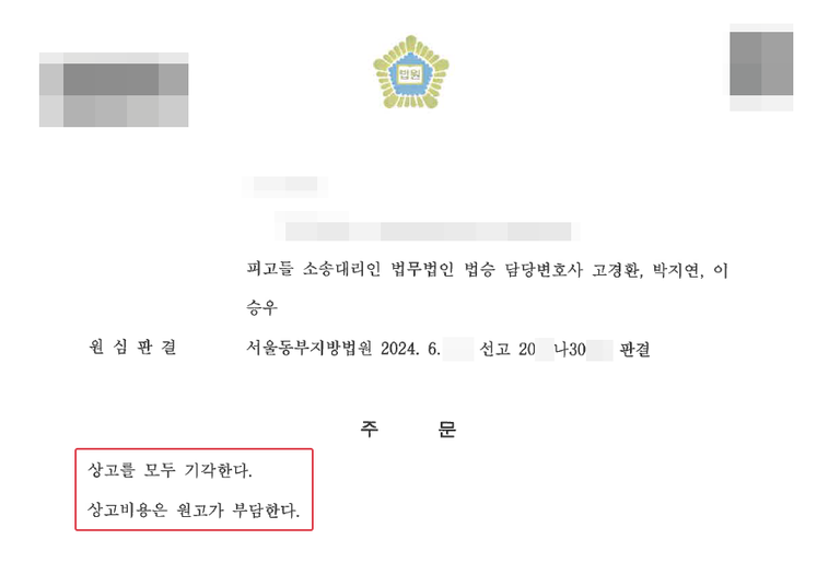 회사는 이에 불복하여 항소하였으나 항소심 재판부 역시 1심 판결이 옳다며 항소 기각하였고, 또 다시 상고하였으나 대법원은 회사의 주장은 상고 이유조차 되지 않는다며 심리불속행기각 하였습니다.