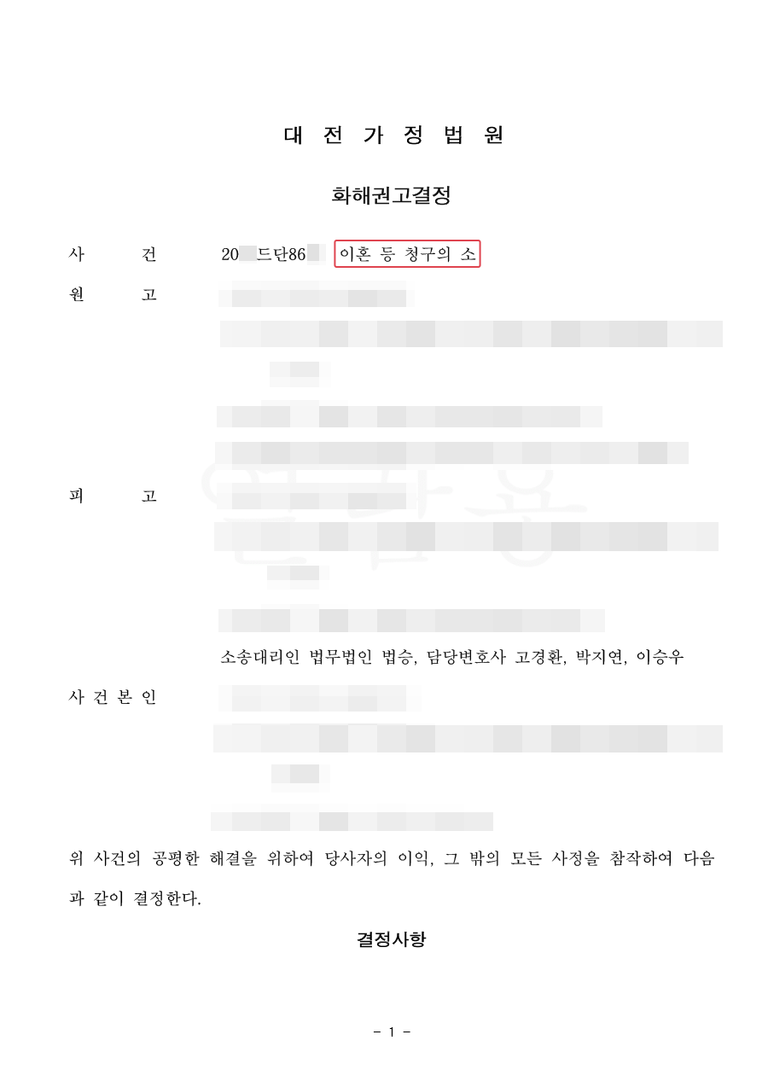본건은 남편이 무엇을 잘못하며 혼인파탄에 어떤 책임이 있는지를 하나하나 짚어줌으로써, 남편 스스로도 반성을 하게 되고 합의에 따른 화해권고결정으로 인해 조기에 원만히 종결된 바람직한 사례라고 할 것입니다.