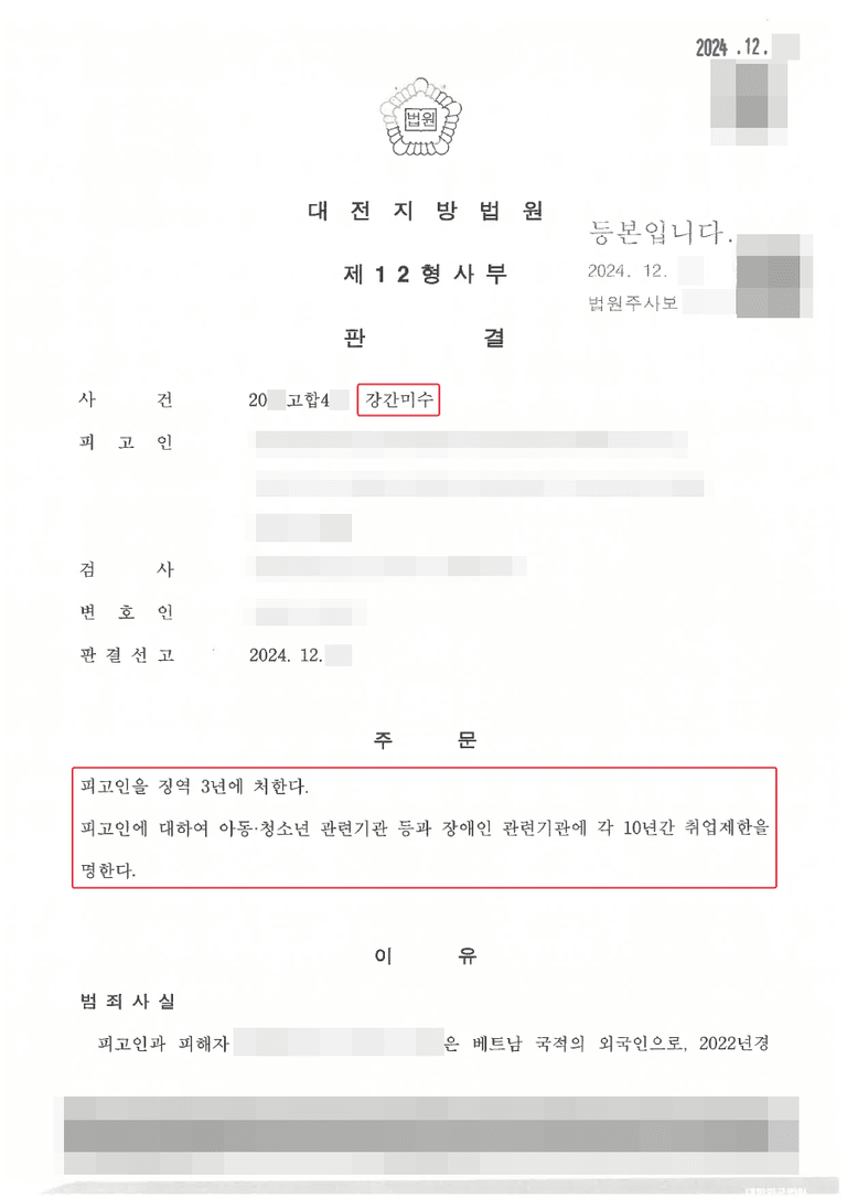 피고인은 징역 3년, 아동ㆍ청소년 관련기관 등과 장애인 관련기관의 각 10년의 취업제한을 선고받았습니다.