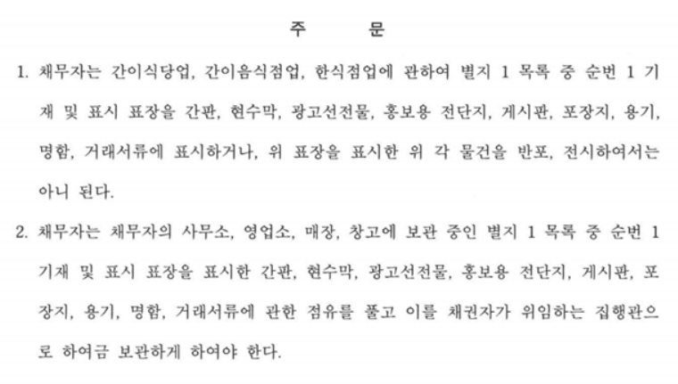 이 사안은, 신청인이 상표를 등록하여 식당을 운영하고 있었는데, 피신청인이 이와 유사한 상표를 무단으로 사용하자 신청인이 상표권 침해금지 가처분을 신청한 사안입니다.