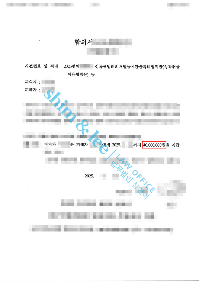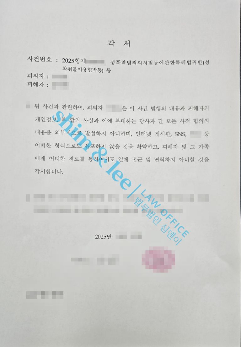 - 심앤이는 혹시 모를 가해자의 보복 및 2차 가해 가능성을 완벽하게 차단하기 위해 비밀유지, 촬영물미소지, 접근금지, 통신제한 조항을 꼼꼼히 작성한 각서를 작성해 피의자의 서명을 받아냈고, 성공적으로 합의를 마무리하였습니다.