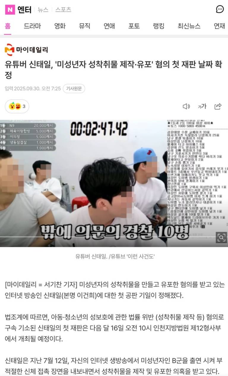 유튜버 신X일이 성인이 아직 안 된 (여장)남자와의 방송으로 인하여 구속되어 재판을 받고 있습니다. 유튜브 라이브에 후원을 한 사람들도 소환조사가 이루어지고 있습니다.\