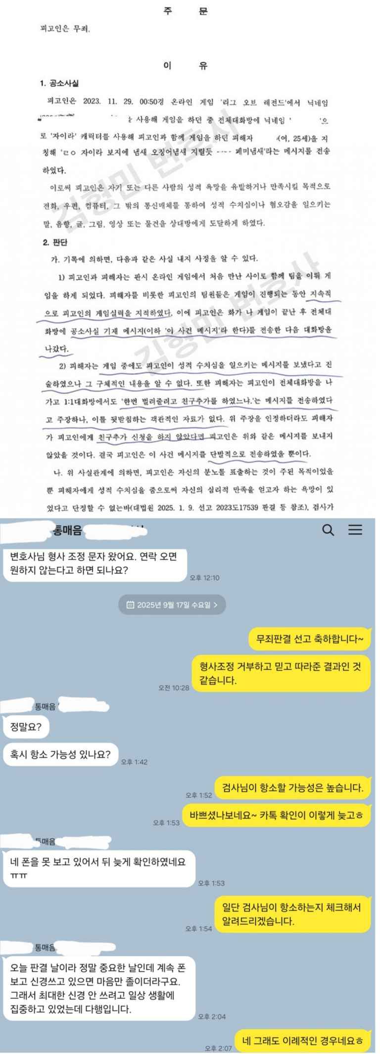 통매음 무죄판결이야 너무 많이 받아서 특이한 것은 없으나 평소와 달랐던 것은 검사님이 항소를 하지 않았다는 것입니다. 지금 검사님들 분위기가 좀 어수선한 것 같습니다. 지금까지는 거의 대부분의 검사님들이 사생활을 포기하면서 야근을 밥 먹듯이 하고 몸을 갈아넣으며 일을 하였는데 이제는 "내가 그렇게까지 왜?" 이런 느낌인 것 같습니다. 제도가 바뀌는 내년까지 과도기 단계가 혐의없음 불기소처분과 무죄판결을 받기 매우 유리한 시점이라고 제 개인적으로는 생각하고 있습니다.