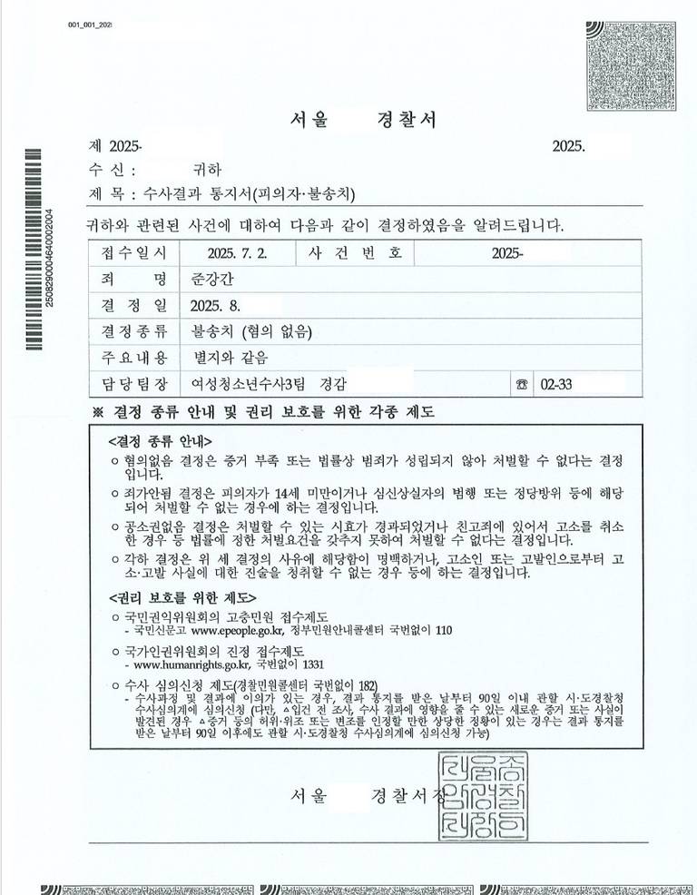그 결과, 경찰은 불송치 결정을 내렸고, 검찰 또한 기록을 반환하며 사건은 종결되었습니다.