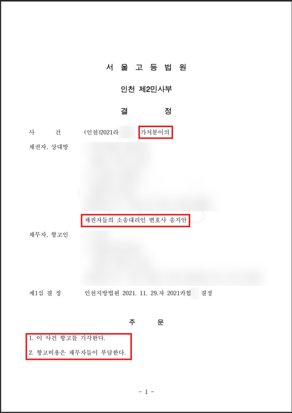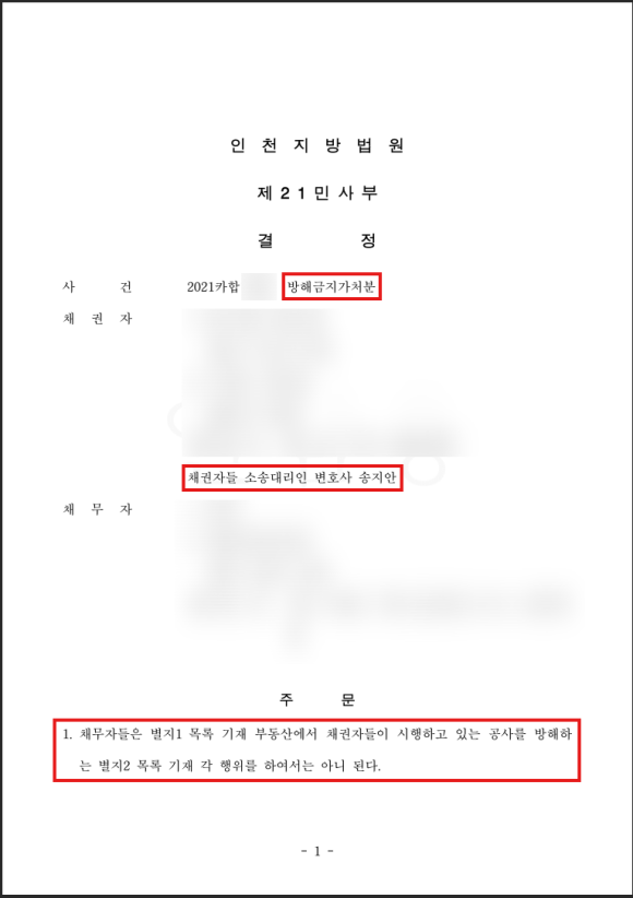 법원은 이상과 같은 법률사무소 송지의 주장을 받아주셔서 공사방해금지가처분 결정을 인용하여 주셨습니다. 상대방은 이의신청에 이어 항고까지 하였으나, 그 모든 절차에서 전부 법률사무소 송지가 승소하였습니다.