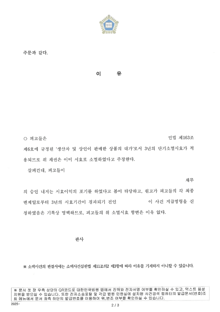 자료 등을 꼼꼼히 찾아내서 소멸시효 중단 사유를 주장하고 시효가 완성되지 않았다고 방어했습니다.