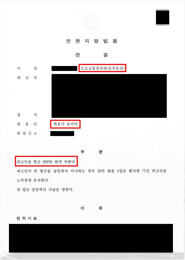 이러한 노력의 결과 음주운전 3회임에도 불구하고 벌금형 200만원을 선고받을 수 있었습니다.