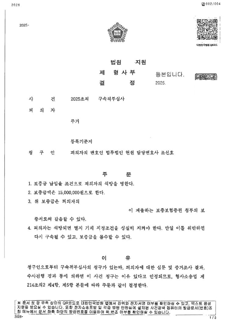 그리고 구속적부심에서 인용이 되어 보증금 납부 조건으로 석방이 되었습니다.