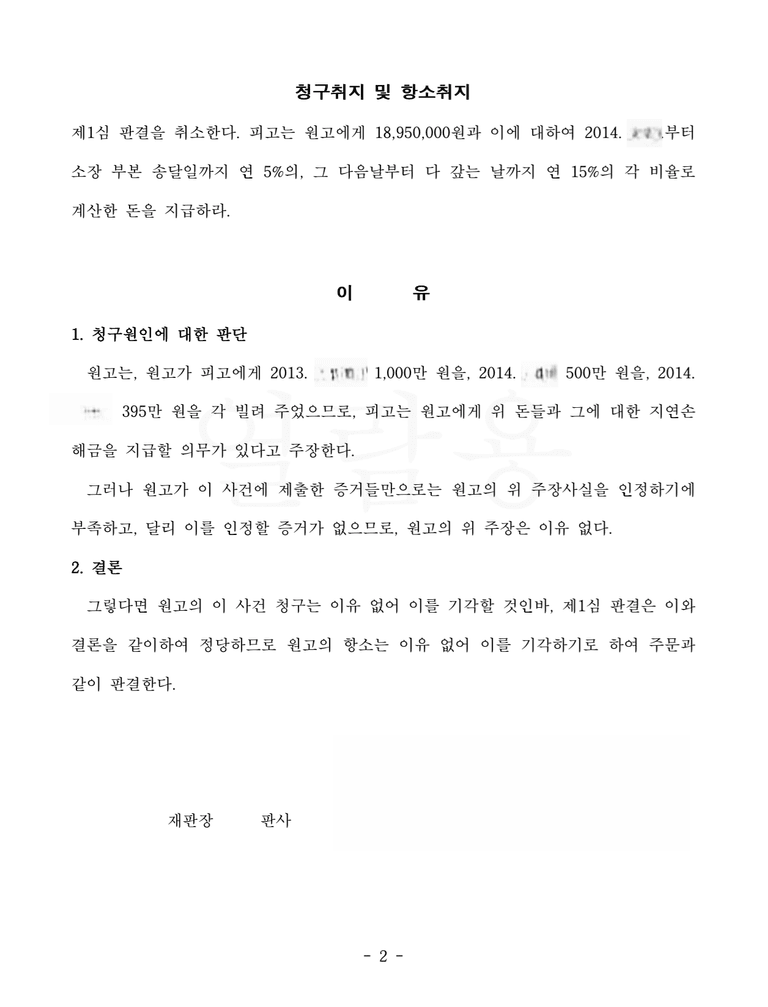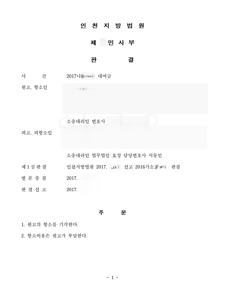 저는 즉각 응소하여 의뢰인이 원고로부터 금전을 수수한 사실은 있으나 이는 대여가 아니라는 점을 주장 입증하였고 1심은 원고 청구를 기각하고 항소심 역시 항소를 기각하였습니다.