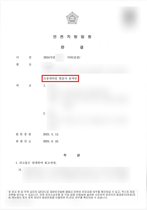 법률사무소 송지의 변호사들은 사건 해결을 위해 피고들이 다달이 금원을 지급하기로 약정한 사실과 그에 부합하는 증거를 제시하면서 소장을 접수하였습니다. 그리고 다툼 끝에 피고들이 매달 원고에게 정산금의 지급할 것을 인정하는 판결을 선고받을 수 있었습니다.