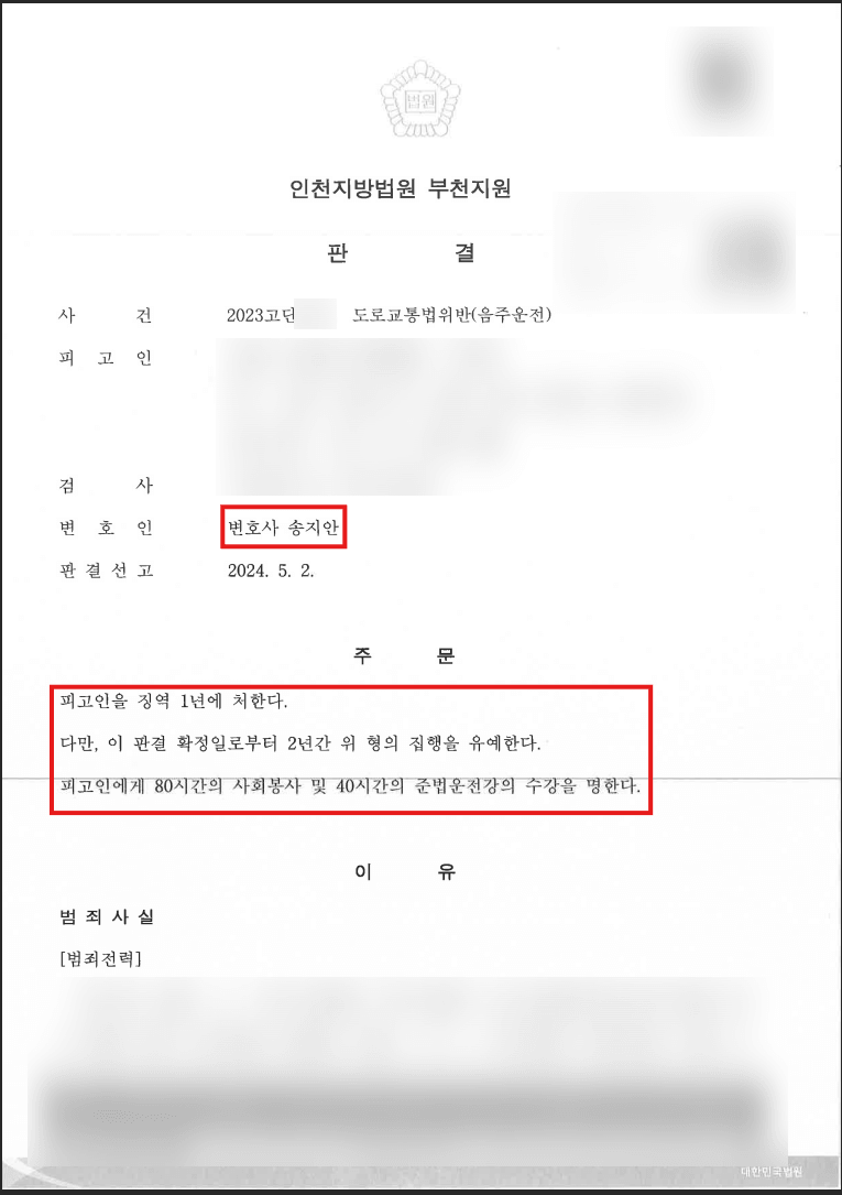 의뢰인께서는 10년 이내에 3회째 음주운전을 범하셨으며, 이와 같은 사실관계는 판결문 중 '불리한 정상'에 그대로 기재되었습니다.