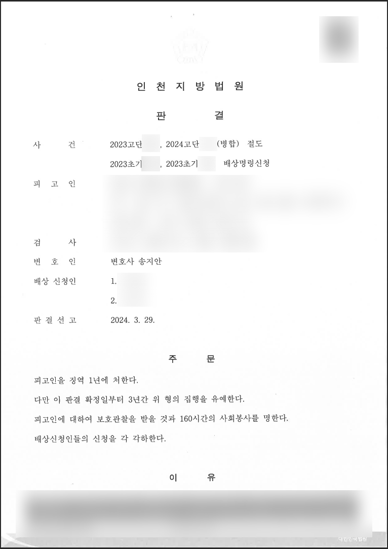 안녕하세요, 인천 법률사무소 송지 배성권 변호사입니다. 제가 오늘 소개할 사례는, 저희 사무실에서 수행한 절도죄 집행유예 판결 사건입니다.