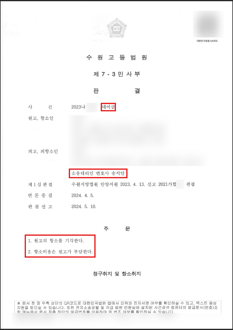 법원은 이러한 법률사무소 송지의 주장을 받아주셔서 원고의 청구를 기각하였을 뿐만 아니라, 이어진 항소심에서도 원고의 항소를 기각하여 주셨습니다. 최종적으로 의뢰인의 손을 들어준 것입니다.