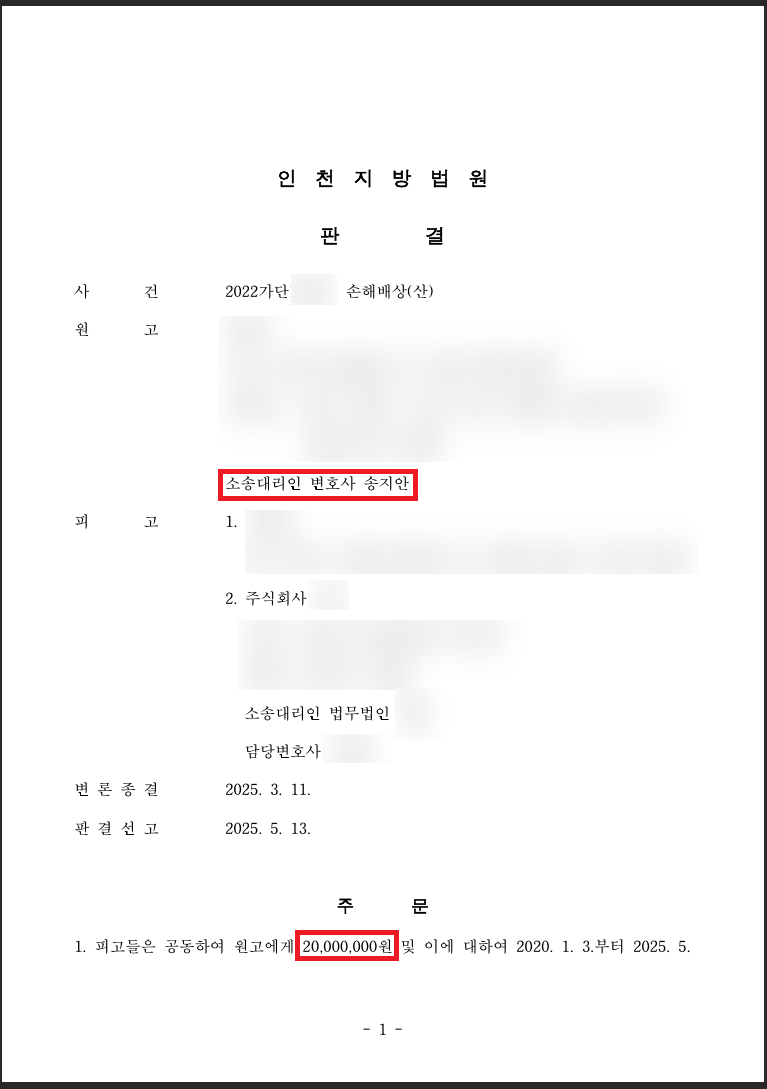 안녕하세요, 인천 법률사무소 송지 파트너 변호사 배성권입니다. 오늘은 저희 사무실에서 진행한 사건 중 건설현장의 사고로 인하여 위자료 청구를 하였고, 그 결과 2,000만 원이 인정된 사례를 소개합니다.