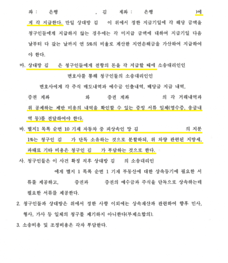 결국 망인의 부동산과 각 금융재산에 관하여 법정상속분인 3분의 1씩 분할하고, 의뢰인과 망인이 공동소유하는 자동차는 의뢰인이 단독 소유하는 것으로 합의가 되었습니다.