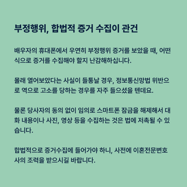 많은 분들께서 남편의 휴대폰을 우연히 보았을 때 어떤 식으로 증거를 수집해야 할지 난감해하십니다. 몰래 열어보았다는 사실이 들통날 경우, 정보통신망법 위반으로 역으로 고소를 당하는 경우를 자주 들으셨을 텐데요.
