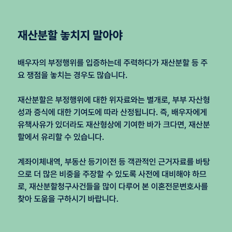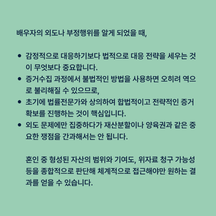 또한 외도 문제에만 집중하다가 재산분할이나 양육권과 같은 중요한 쟁점을 간과해서는 안 됩니다. 혼인 중 형성된 자산의 범위와 기여도, 위자료 청구 가능성 등을 종합적으로 판단해 체계적으로 접근해야만 원하는 결과를 얻을 수 있습니다.