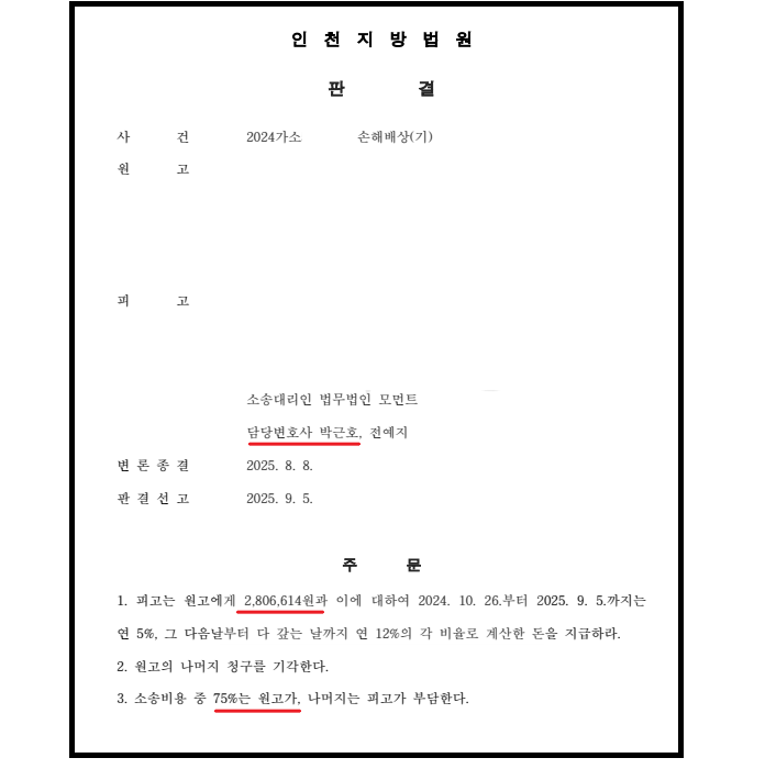 적극적인 대응 결과, 재판부에서는 1,100만원이 넘는 상대방의 청구금액 중 75% 이상을 기각하고, 280만원만 인용하여 주셨습니다.