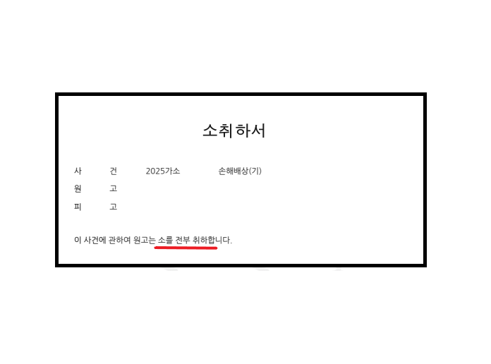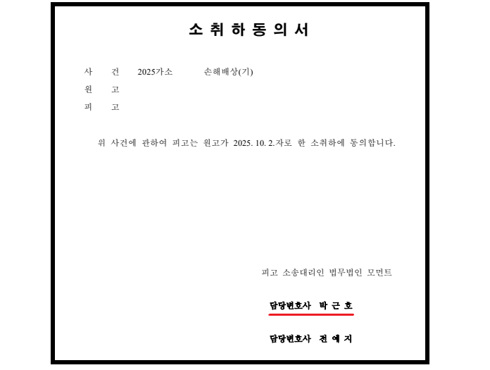 저의 치밀한 법리 검토와 사실관계 분석이 담긴 적극 대응의 결과, 원고는 자신에게 승산이 없다는 것을 깨닫고, 자진하여 소취하서를 제출하였습니다.