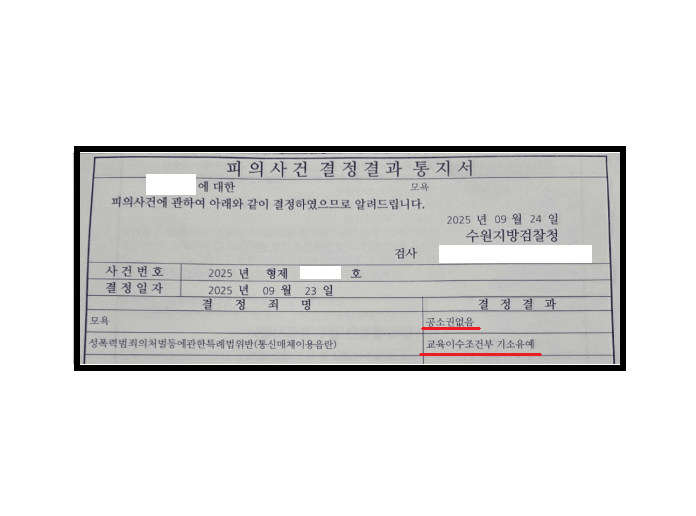 그 결과, 모욕 혐의에 대해서는 피해자와의 합의를 근거로 ‘공소권 없음’ 처분을, 통매음 혐의에 대하여는 의뢰인의 장래와 반성을 고려하여 교육조건부 기소유예 처분을 내려 주셨습니다.