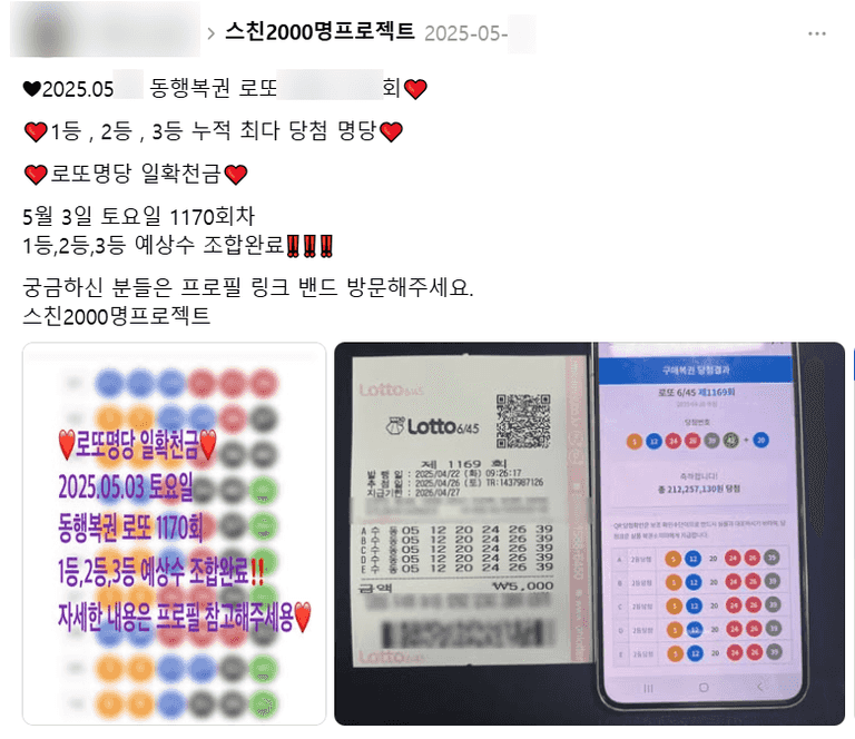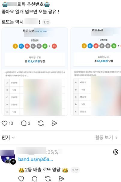 인스타그램이나 스레드 등 SNS에서는 ‘로또 1등 당첨 인증’이라는 문구와 함께 당첨금 수령 사진을 올리며, 자신이 참여 중인 ‘로또번호 공유 네이버 밴드’를 홍보하는 게시글이 다수 확인되고 있습니다.