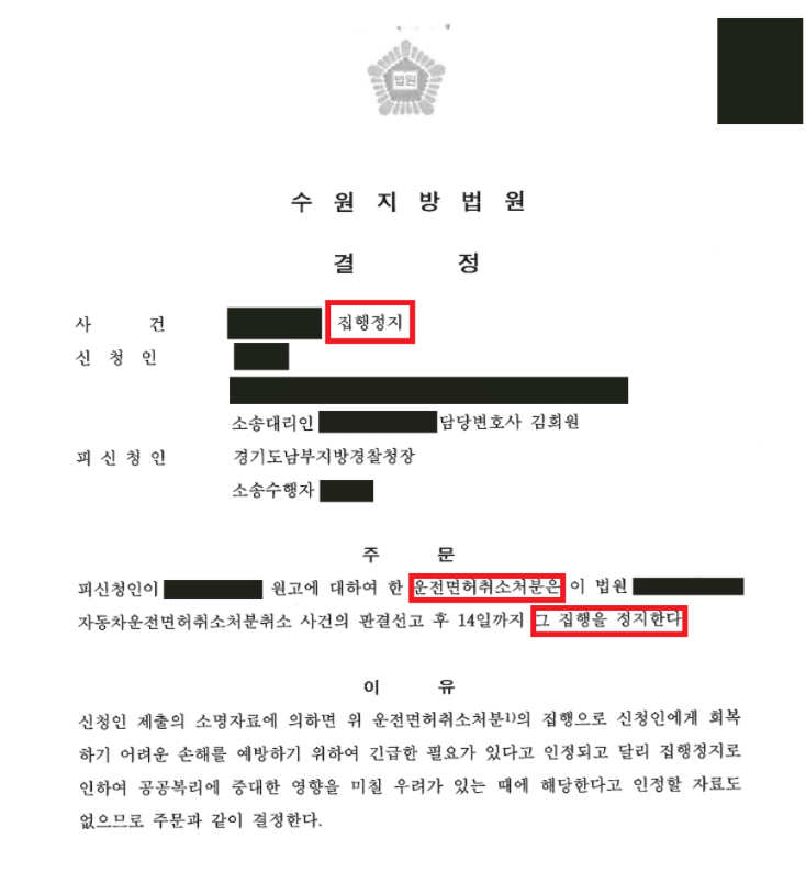제가 담당하였던 운전면허 취소 집행정지 성공사례를 소개하여 드리겠습니다.