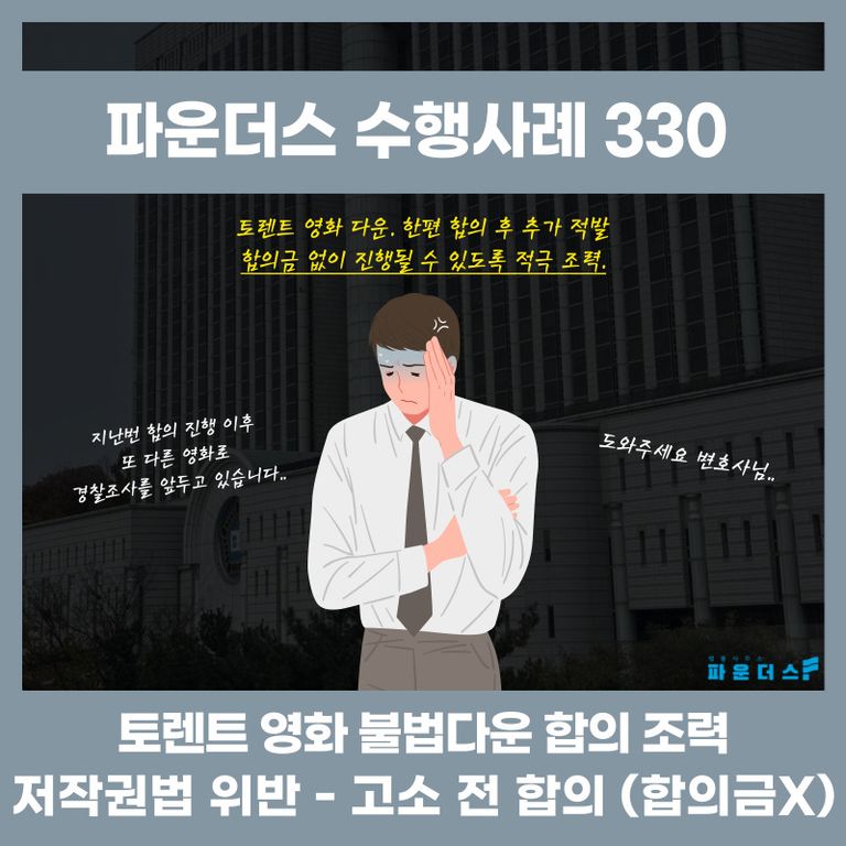 결과적으로 의뢰인은 추가로 입건된 저작권법 위반 혐의에서 경찰조사 전 합의금 없이 원만한 합의를 이루어 고소 취하로 마무리 지을 수 있었습니다.