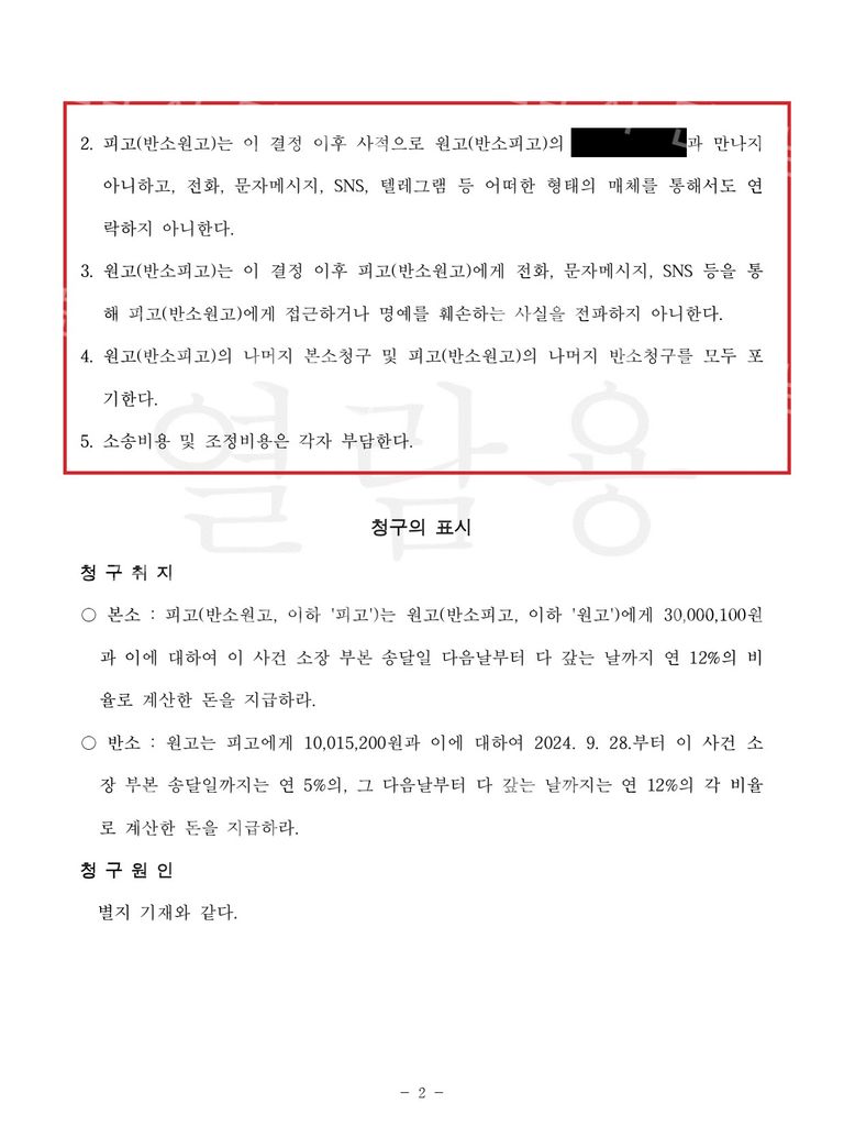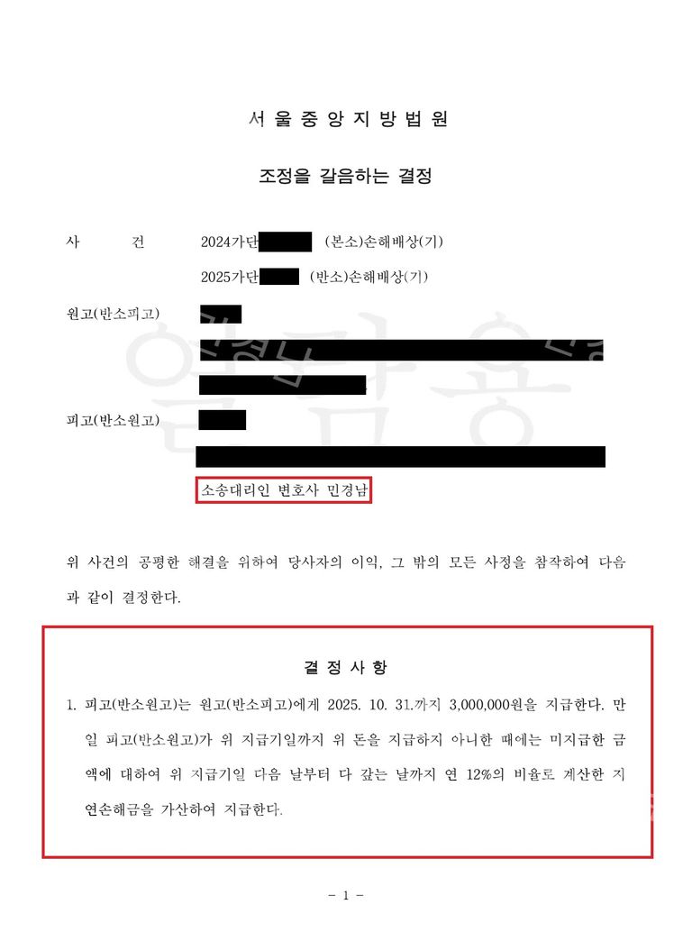 저는 사건을 기각시킬 목적으로 이의신청을 하고자 하였으나, 의뢰인께서 사건 결과에 스스로 만족하시고 도의적인 차원에서 300만원을 지급하는 선에서 사건을 마무리 하시길 원하였고, 당초 3,000만원이 넘는 청구금액에서 10분의 1 수준으로 감액을 시킬 수 있었습니다.