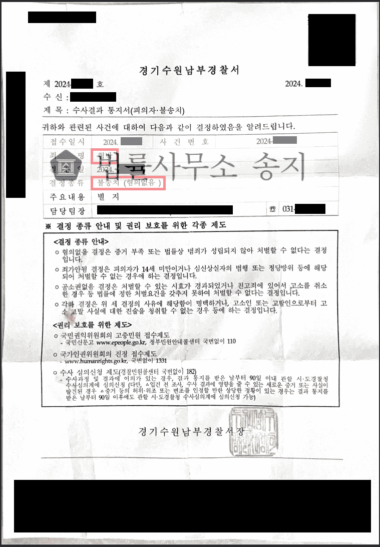 오늘은 상간녀가 의뢰인을 협박죄로 고소한 사건에서 불송치 결정을 받은 사례를 소개합니다.