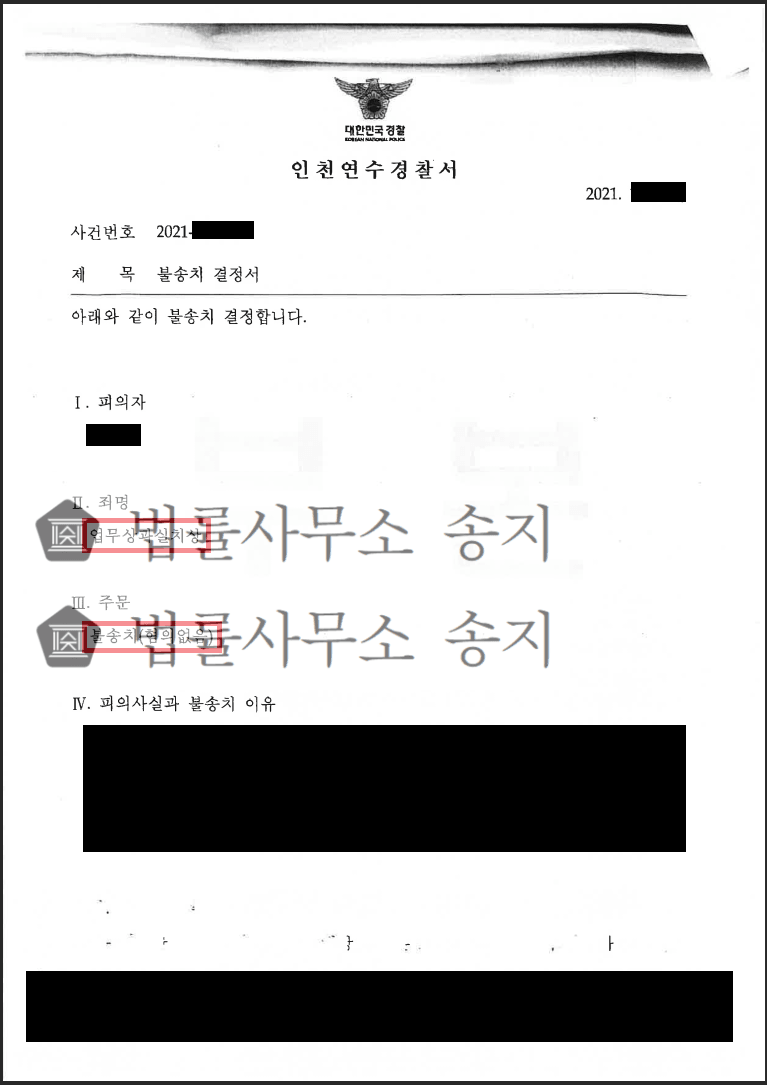 이러한 분위기 속에서 법률사무소 송지는 앞서 말씀드린 기조를 바탕으로 충실한 조력을 제공하였고, 결국에는 수사기관으로부터 불송치(혐의없음) 결정을 받을 수 있었습니다.