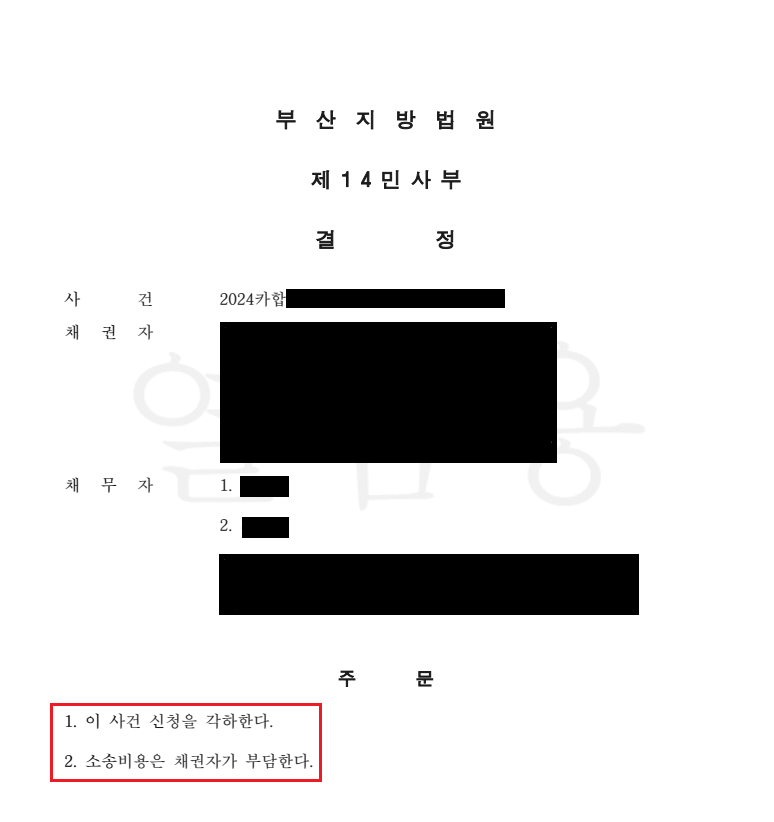 결국 부산지방법원은 “이 사건 신청을 각하한다. 소송비용은 채권자가 부담한다.”라는 결정을 내려,