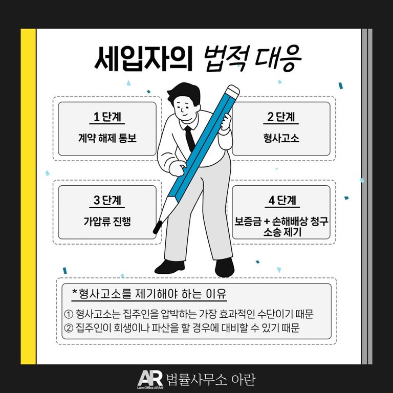 형사고소를 당하게 되면 집주인은 자신이 형사처벌을 받게 될까 두려워 최대한 빨리 문제를 해결하려는 경향이 있습니다. 따라서 형사고소를 제기함으로써 집주인에게 법적 대응의 시작을 알리고, 이를 통해 빠른 문제 해결을 도모할 수 있습니다.