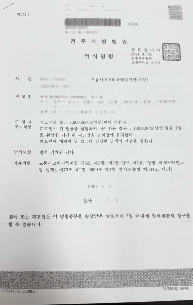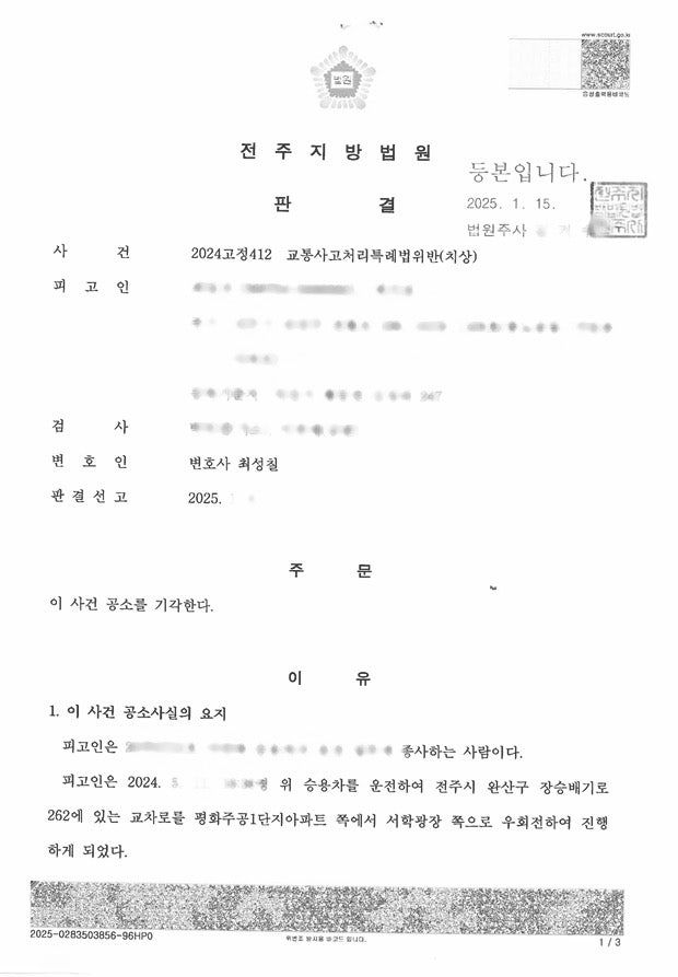 📍사건 개요: 운전을 하시는 도중 교차로에서 우회전을 하시던 도중 사고를 내신 의뢰인은 신호위반 교통사고 치상 혐의로 입건이 되셨습니다. 이에 검찰에서는 사안을 유죄로 판단해 약식 기소를 하였고 법원은 100만원의 벌금을 선고하였습니다.