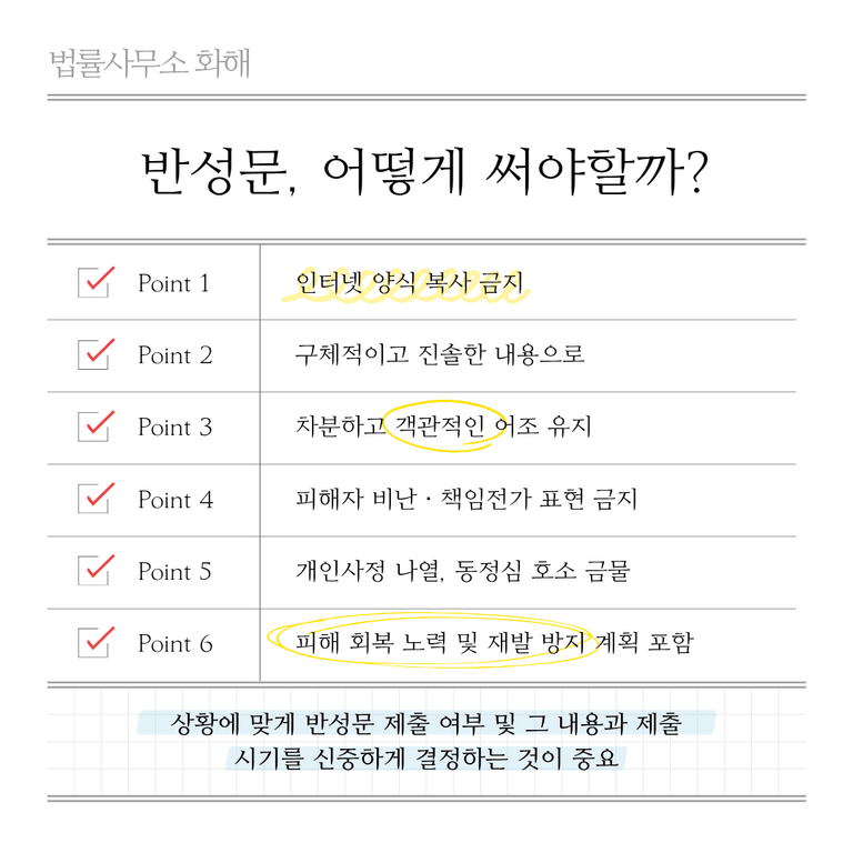 반대로 너무 방어적으로만 작성하거나 인정해야 할 부분까지 회피하려는 태도가 보이면, 진정한 반성이 없다고 판단되어 역효과가 날 수 있습니다. 이처럼 반성문의 내용과 범위를 결정하는 것은 매우 민감하고 중요한 문제이므로 전문 변호사와 충분한 논의를 거쳐 신중하게 작성하는 것이 필수적입니다.